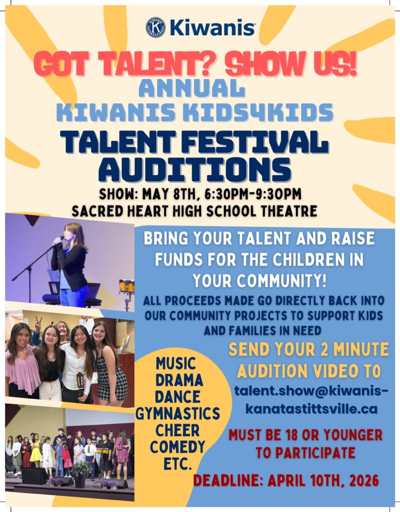 The Kiwanis Club of Kanata-Stittsville was formed in December of 2017 and is committed to providing support services to children and youth within our local community. One of our annual initiatives is to host a Children and Youth Talent Festival- the K4K Talent Festival. This is not a Talent Contest; local Children and Youth showcase their talent and in doing so raise funds that can be used to support children and youth throughout the community. Additionally, the participants are able to build their confidence, make new friends and also claim community service hours. We use the funds raised to support children and youth in need and at risk within the community; both directly and through local Outreach Programs.